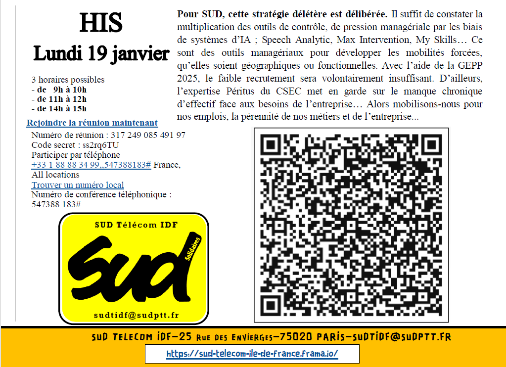 Pour SUD, cette stratégie délétère est délibérée. Il suffit de constater la multiplication des outils de contrôle, de pression managériale par les biais de systèmes d’IA ; Speech Analytic, Max Intervention, My Skills… Ce sont des outils managériaux pour développer les mobilités forcées, qu’elles soient géographiques ou fonctionnelles. Avec l’aide de la GEPP 2025, le faible recrutement sera volontairement insuffisant. D’ailleurs, l’expertise Péritus du CSEC met en garde sur le manque chronique d’effectif face aux besoins de l’entreprise… Alors mobilisons-nous pour nos emplois, la pérennité de nos métiers et de l’entreprise…